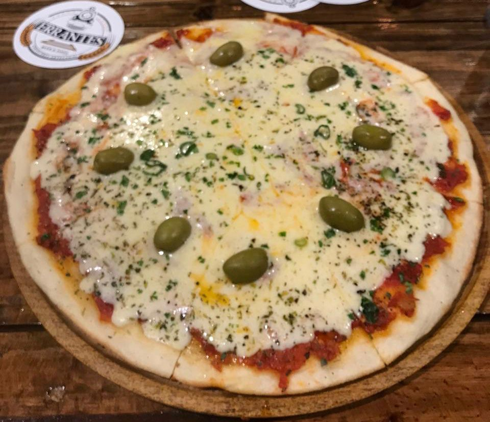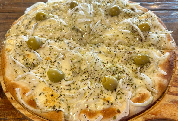 Salsa de tomate, muzzarella, oregano y olivas verdes.