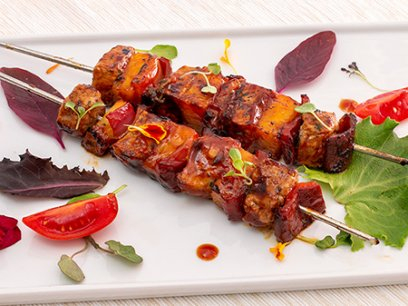 Tiernas tiras de pollo marinadas en una vibrante mezcla...