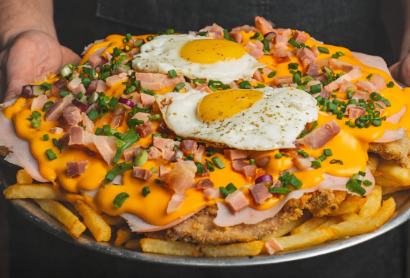 Milanesa de ternera con cheddar, panceta, y papas fritas.