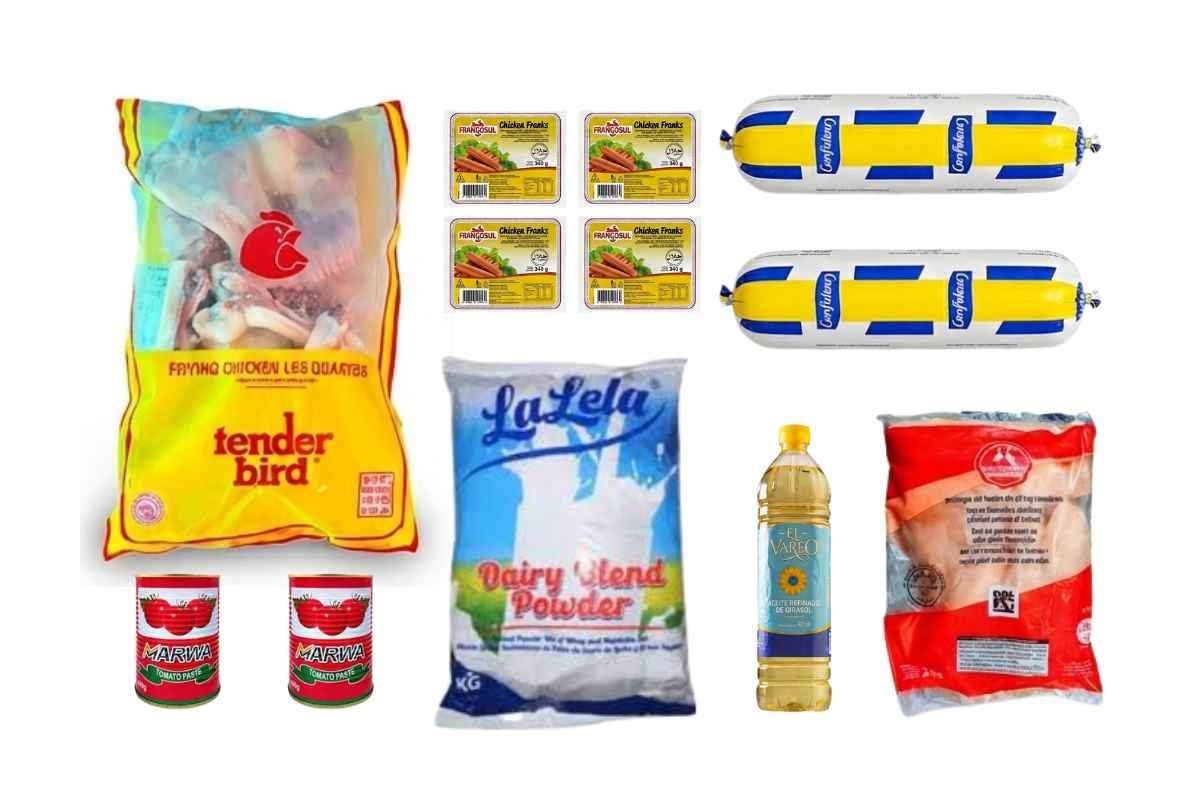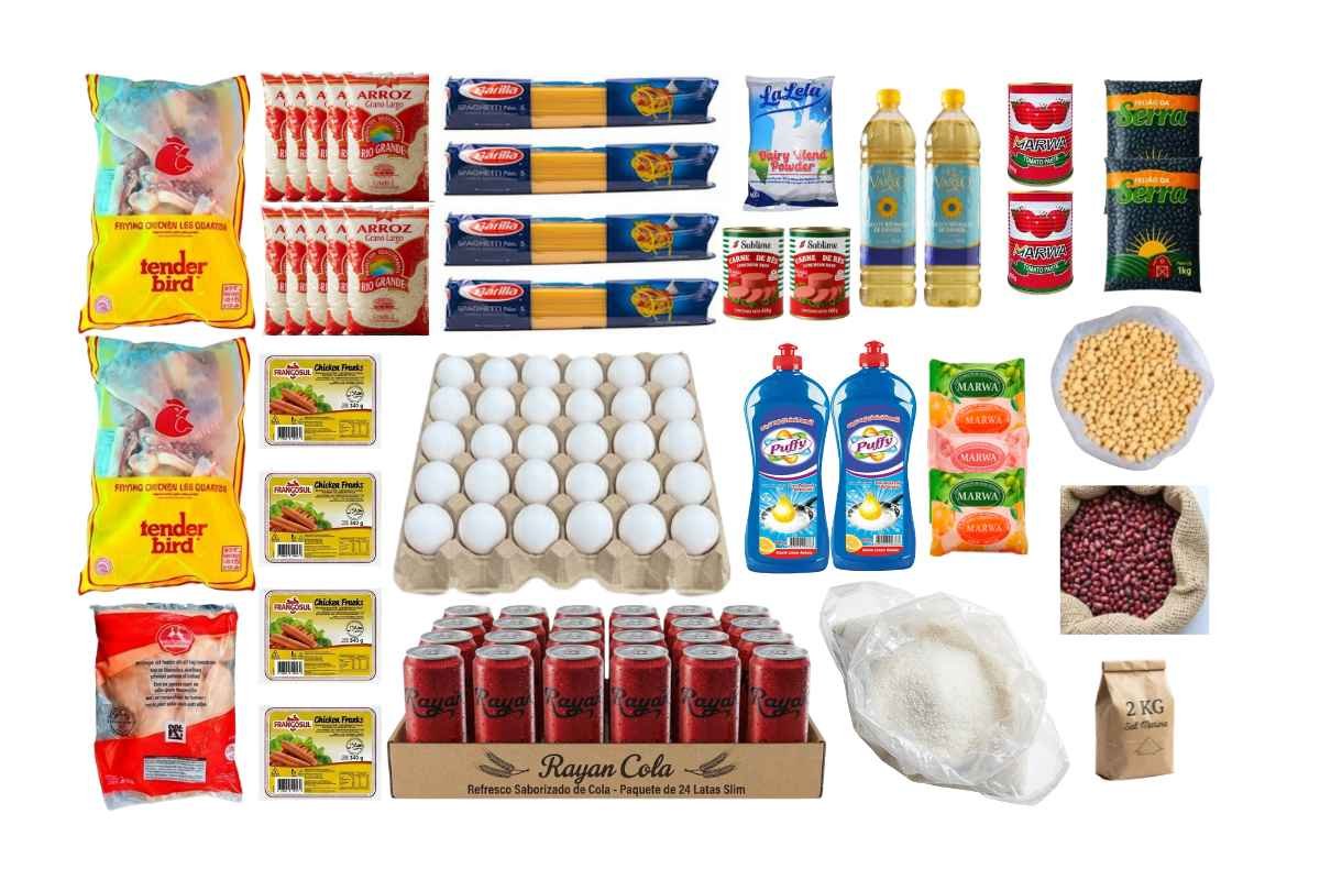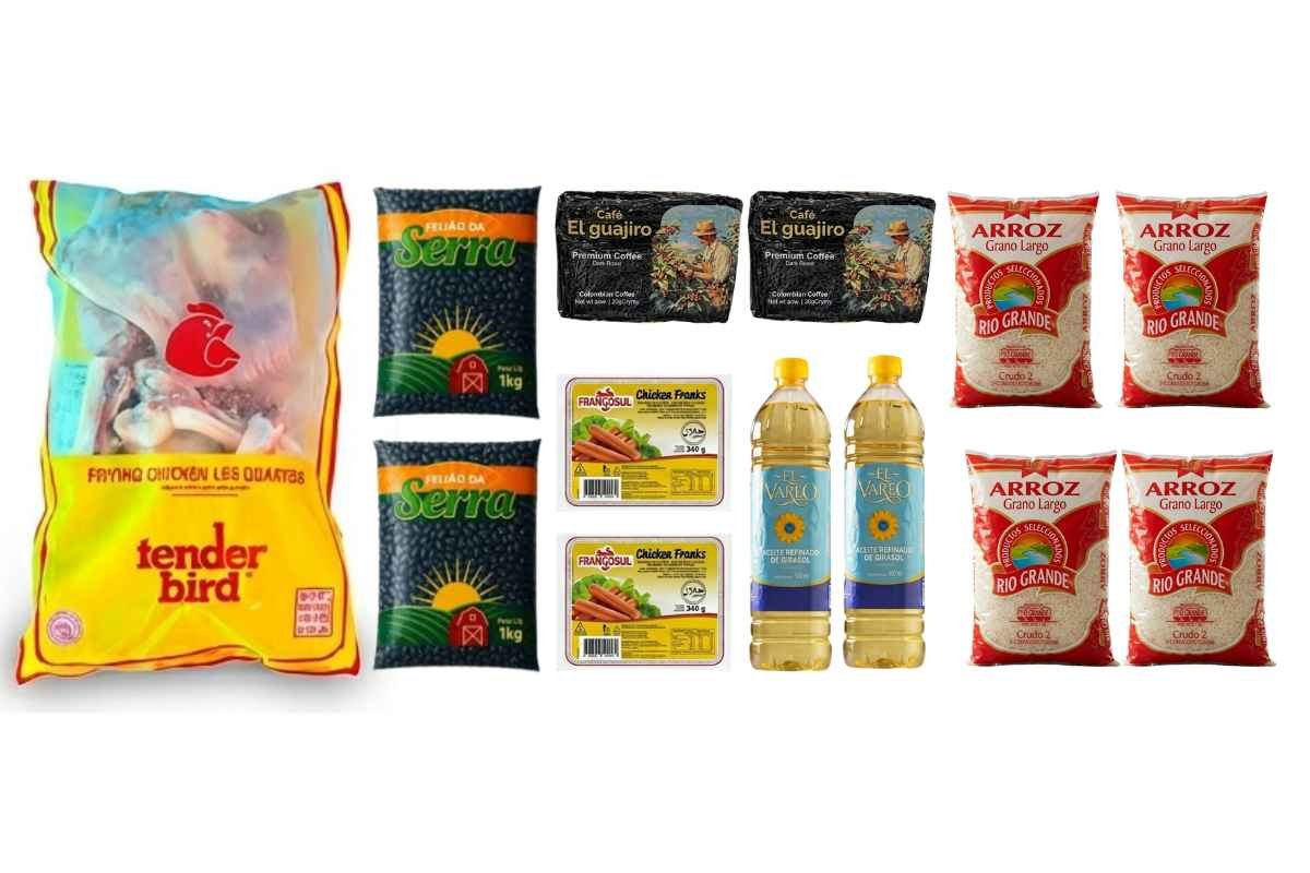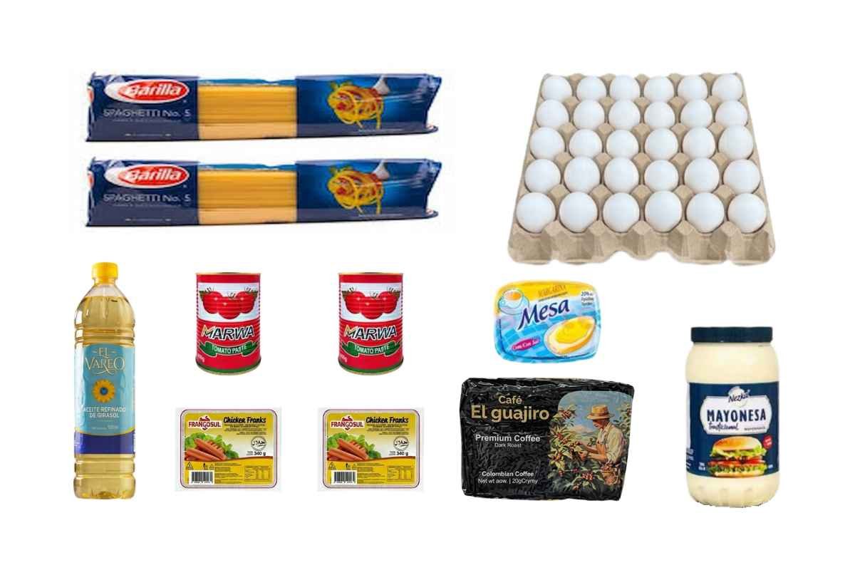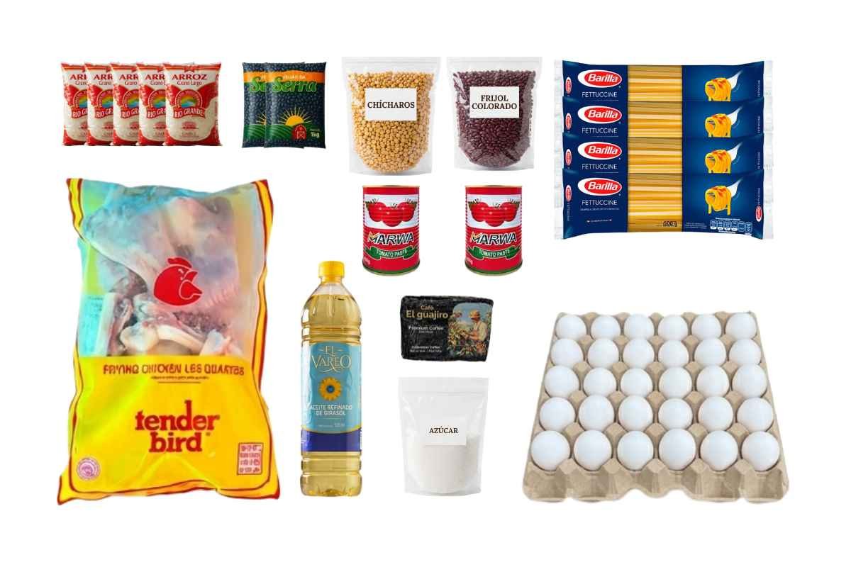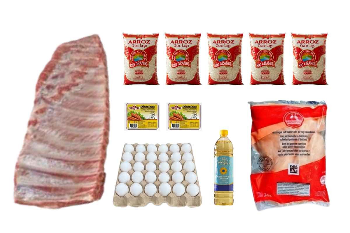 10 paquetes de arroz de 1 kg, 5 paquetes de frijoles negros...