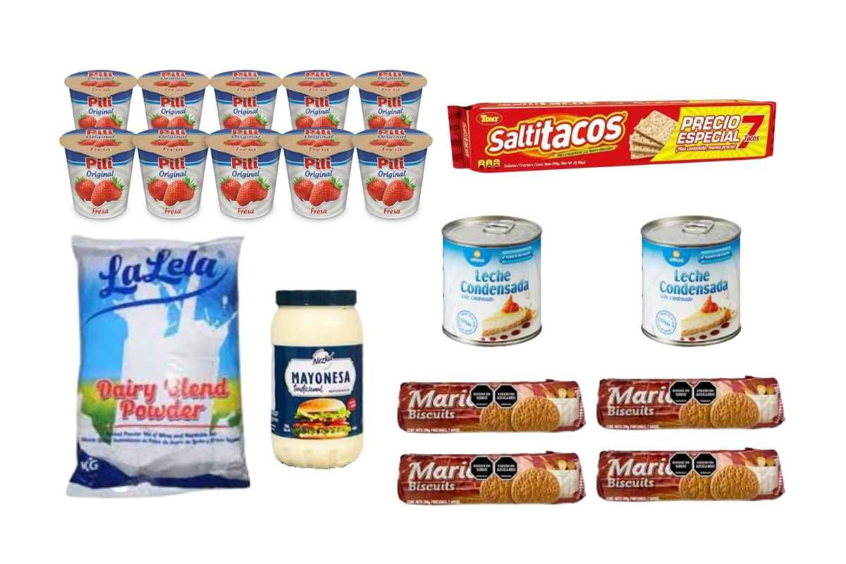 10 potes de yogur, 7 paquetes de galletas saladas, 1 pomo...