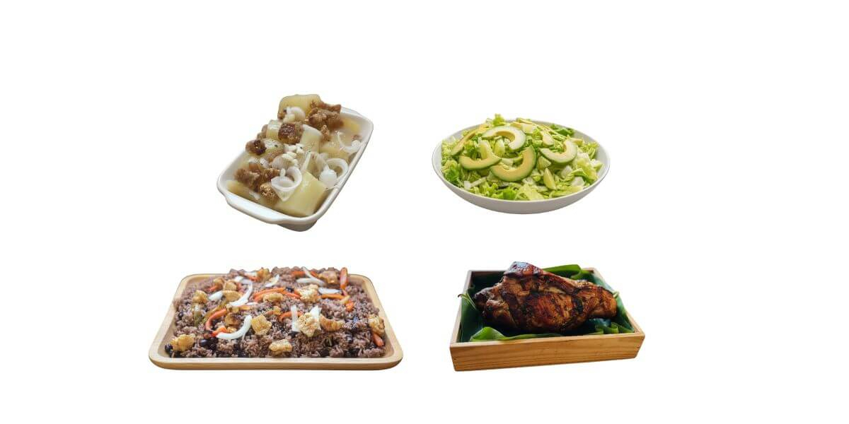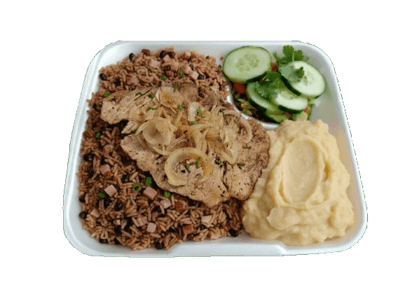 Arroz moro, vianda, ensalada, bistec de cerdo encebollado...