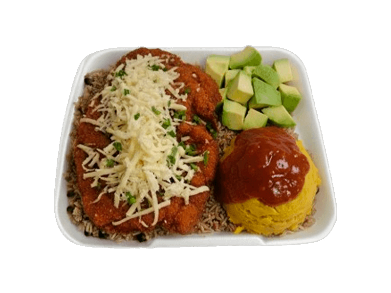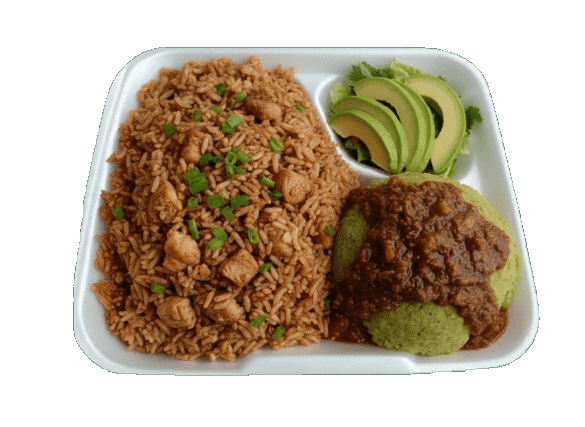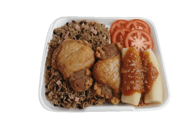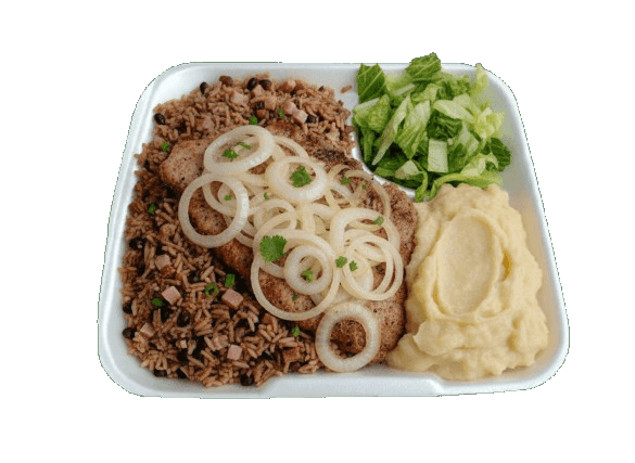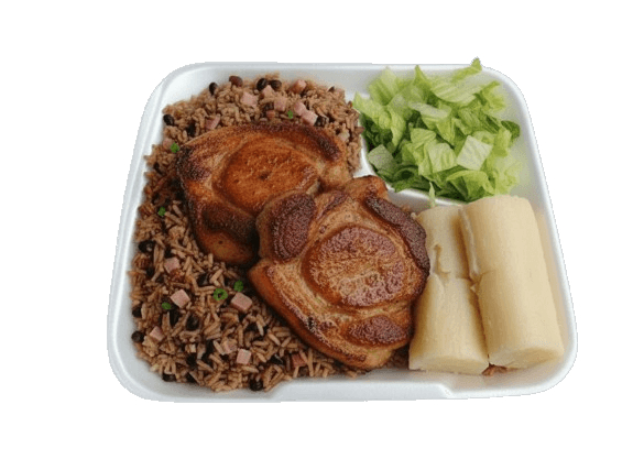 Arroz moro, vianda, ensalada y masa de cerdo frita (150 g).