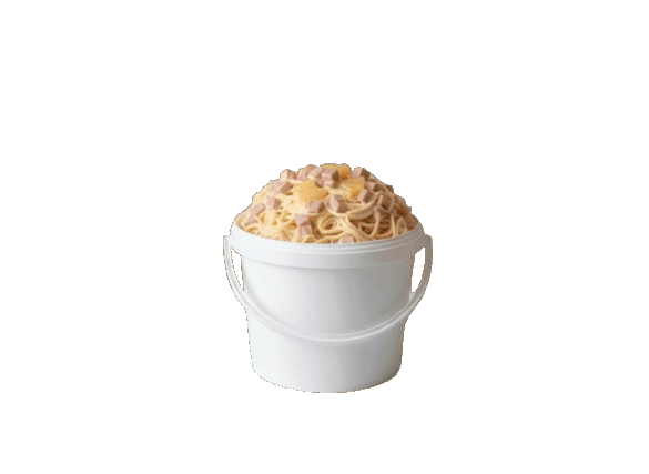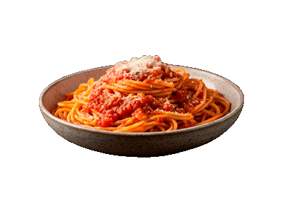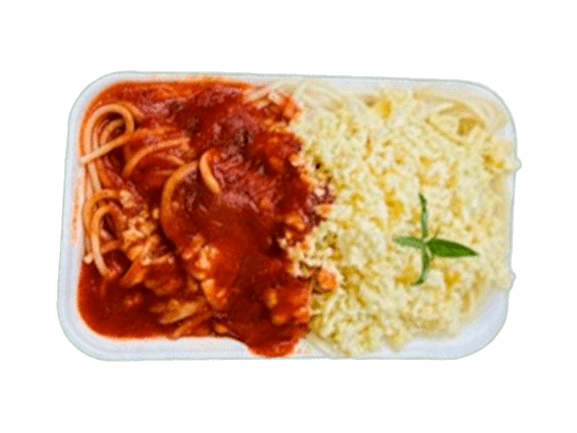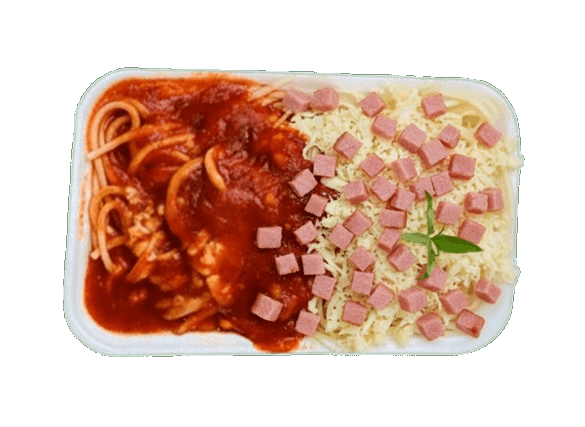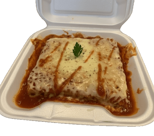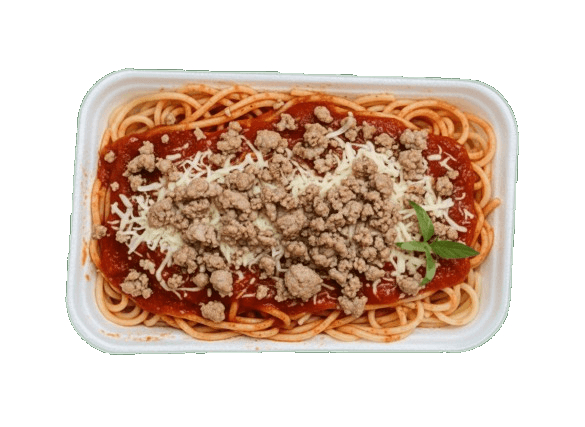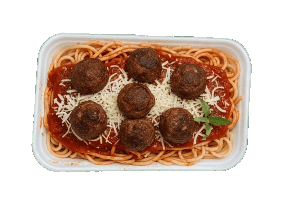 Con Queso Pategrás, Albóndigas de Carne y Salsa de Tomate.