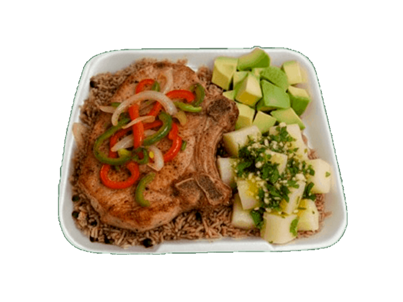 Arroz moro, vianda, ensalada y bistec de cerdo deshuesado...