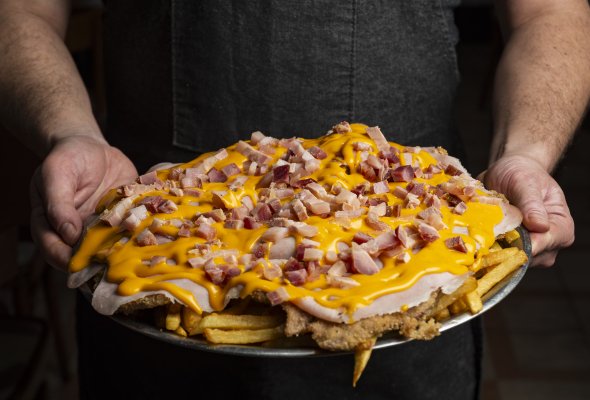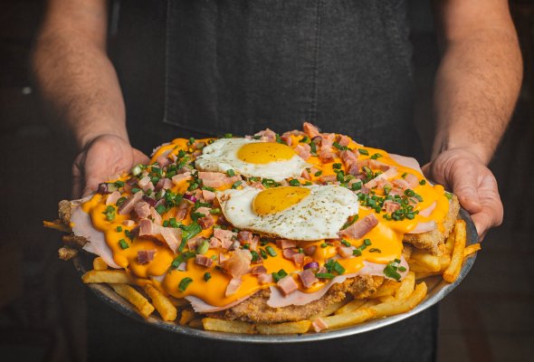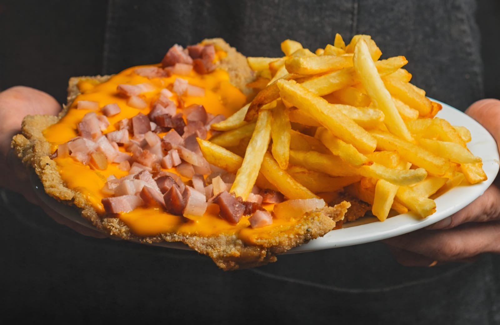 Milanesa de ternera con cheddar, panceta, y papas fritas.