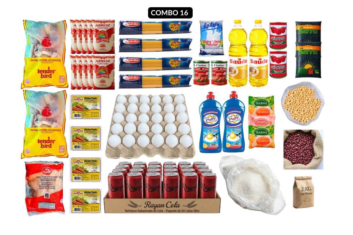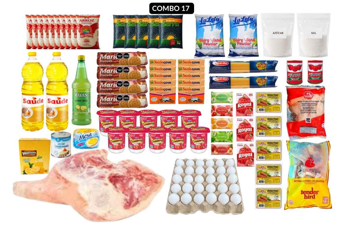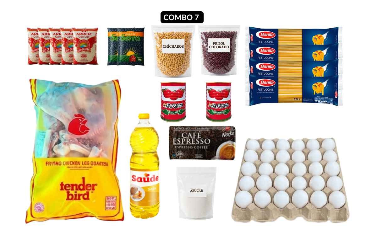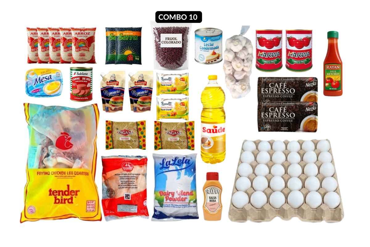 10 paquetes de arroz de 1 kg, 5 paquetes de frijoles negros...