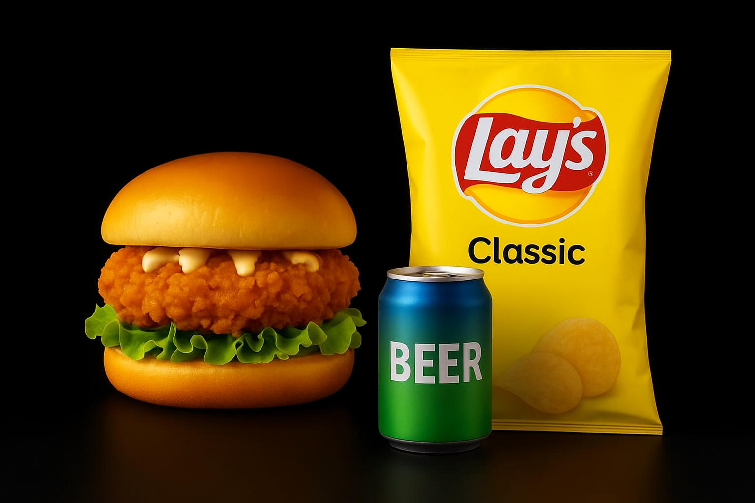 Hamburguesa Crispy, Papas Chips y Cerveza.
